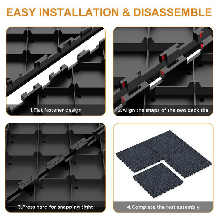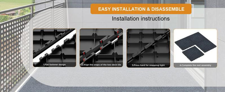 【Easy Snap Connection】Upgraded interlocking mode can realize faster and safer installation without any tools.Different from the snap design of other decking tiles, rectangular snaps makes the connection between flooring tiles closer and not easy to separate.You can also dismantle this outdoor tile in minutes with ease.