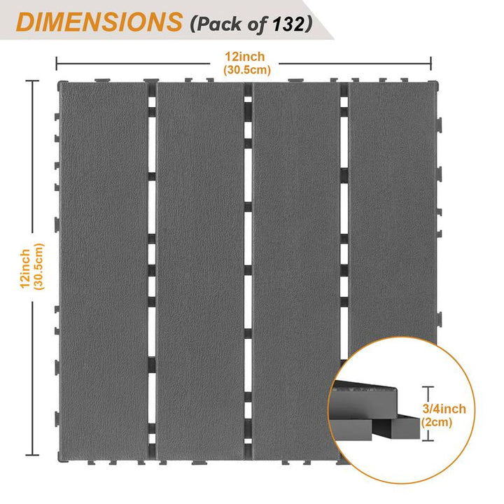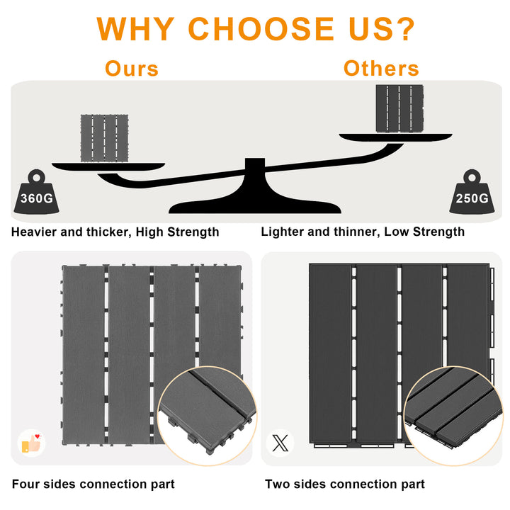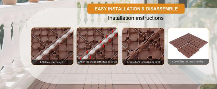 【Easy Snap Connection】Upgraded interlocking mode can realize faster and safer installation without any tools.Different from the snap design of other decking tiles, rectangular snaps makes the connection between flooring tiles closer and not easy to separate.You can also dismantle this outdoor tile in minutes with ease.