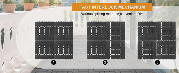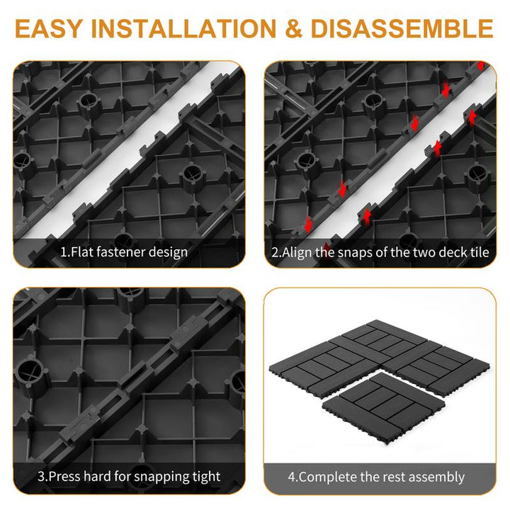 【Easy Snap Connection】Upgraded interlocking mode can realize faster and safer installation without any tools.Different from the snap design of other decking tiles, rectangular snaps makes the connection between flooring tiles closer and not easy to separate.You can also dismantle this outdoor tile in minutes with ease.